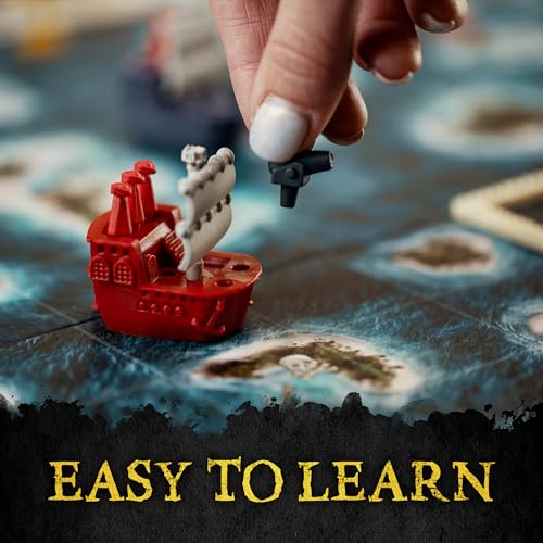 In this pirate-themed game, players navigate treacherous waters, competing to become the wealthiest pirate by collecting resources, expanding their fleets, and conquering islands. Each turn, players decide between moving ships, gathering resources, attacking opponents, or building structures. This decision-making balances strategy with the element of risk in combat. Combat outcomes, determined by dice, add a layer of unpredictability, keeping the game dynamic. The map layout and resource distribution change in each session, which keeps gameplay fresh and encourages varied strategies.